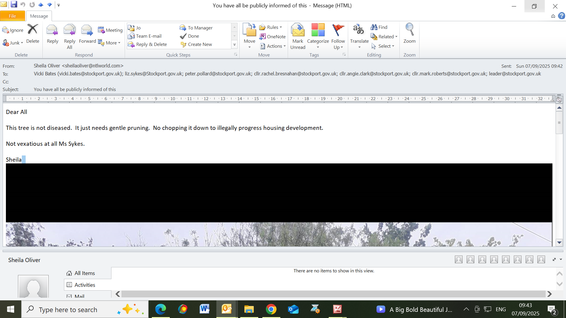 “This tree doesn’t need to be chopped down — it just needs the diseased branches cutting off. But knowing Stockport Council’s track record, I fear they’ll allow it to be destroyed to make housing easier on the site.”