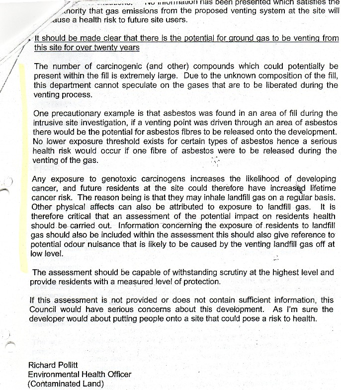 The Environmental Health Officer at the time urged that any risk assessment for future development should withstand the “highest level of scrutiny” and provide “measured protection” for residents. The memo concluded that, without robust information, serious concern would exist about placing people on such ground.