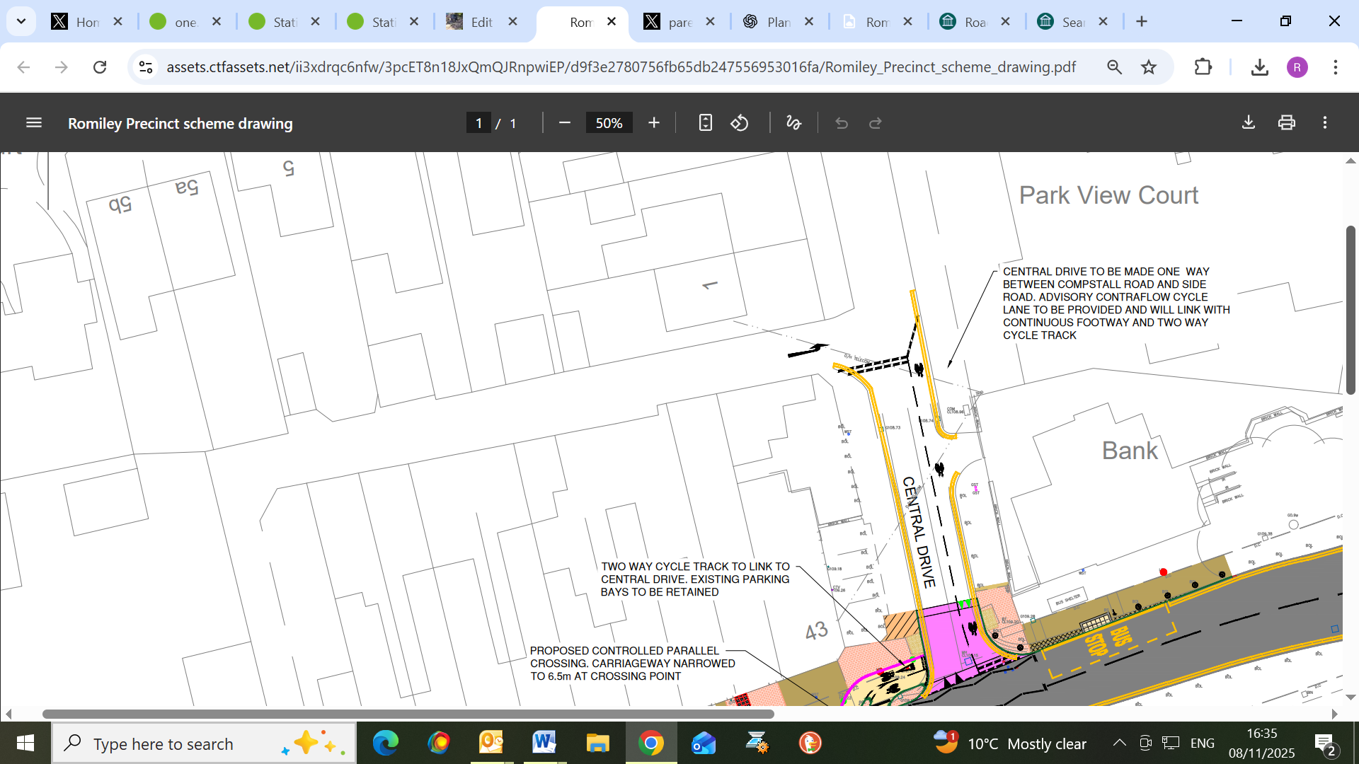 - There is a scheme drawing / design PDF for the Romiley Precinct showing the design details (crossing, two-way cycle track, one-way Central Drive, etc.). That drawing is published by Stockport and is useful to compare against what was constructed. Contentful