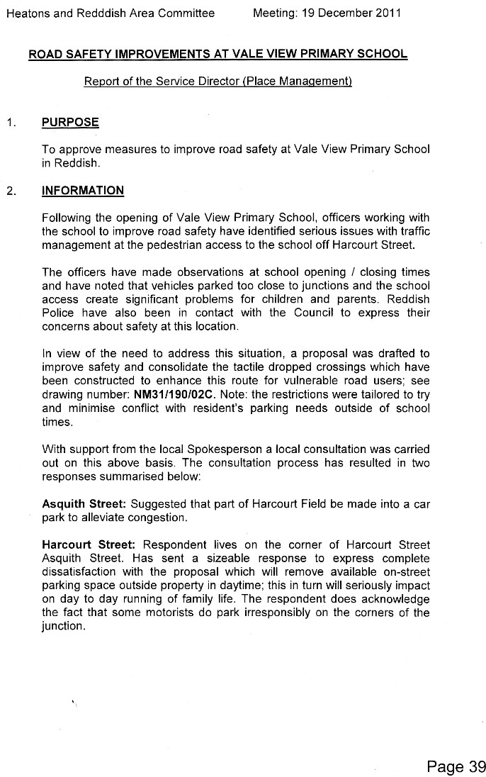 The resident says the issue dates back to a planning decision meeting held several years ago, some time before a North Reddish school opened in 2011. At the time, the resident raised concerns about traffic safety and access arrangements and asked a planning question in advance of the decision meeting.